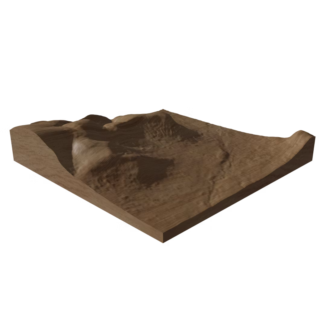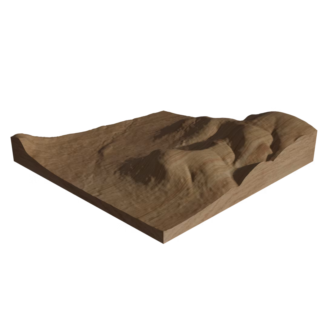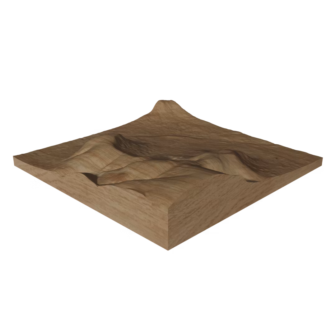 Tredimensionell topografisk karta i trä över Stöten i Sälen.